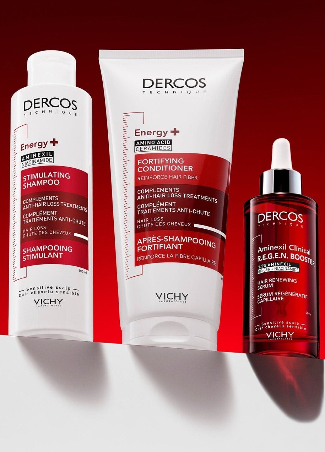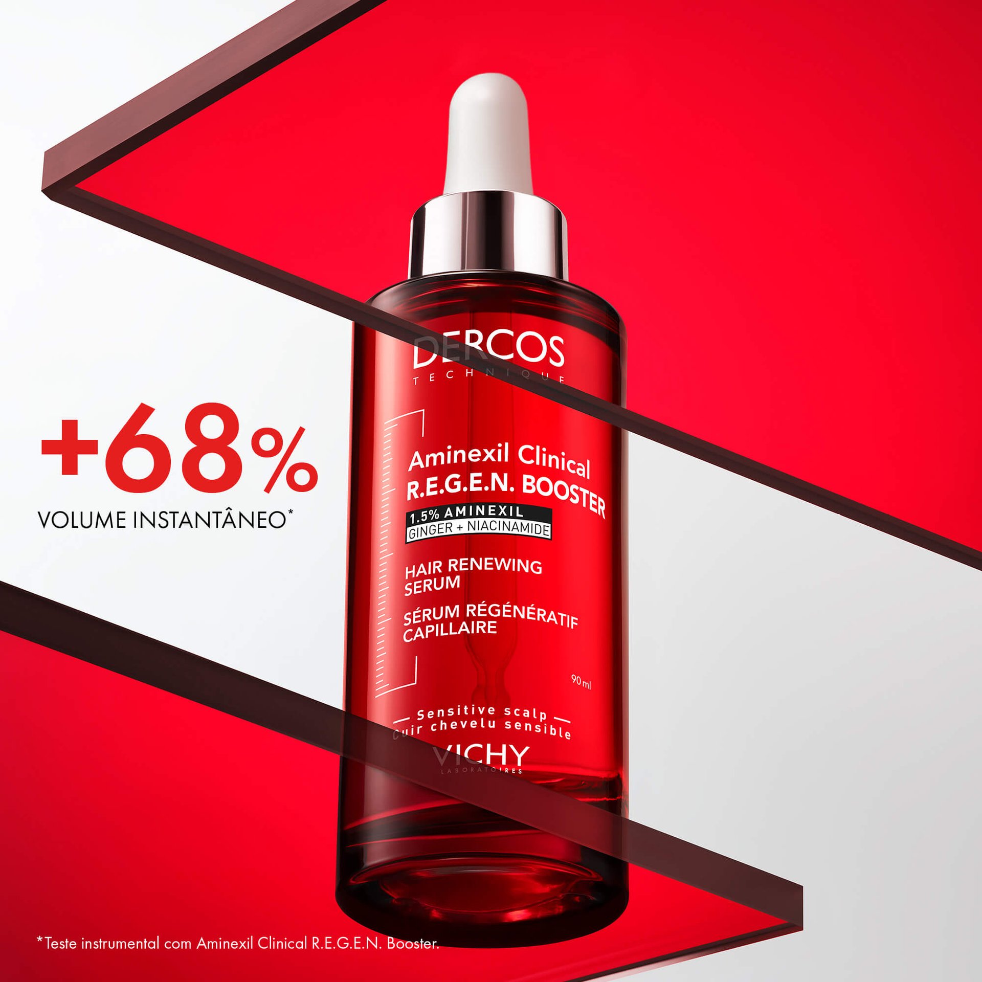 * Estudo clínico com 40 mulheres e 37 homens com 5 aplicações por semana durante 12 semanas. ** Cabelo existente. ***Teste instrumental com Aminexil Clinical R.E.G.E.N Booster. **** Teste instrumental com Champô Energy+ + Condicionador + Aminexil Clinical R.E.G.E.N Booster.