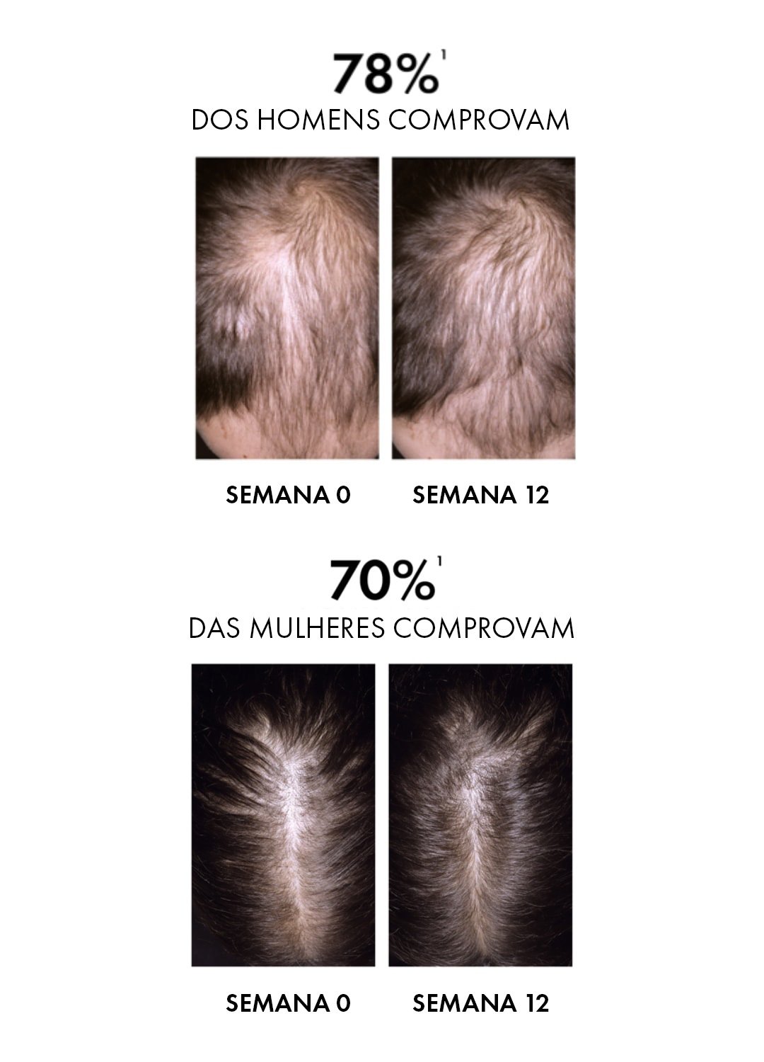 * Estudo clínico com 40 mulheres e 37 homens com 5 aplicações por semana durante 12 semanas. ** De cabelo existente.
