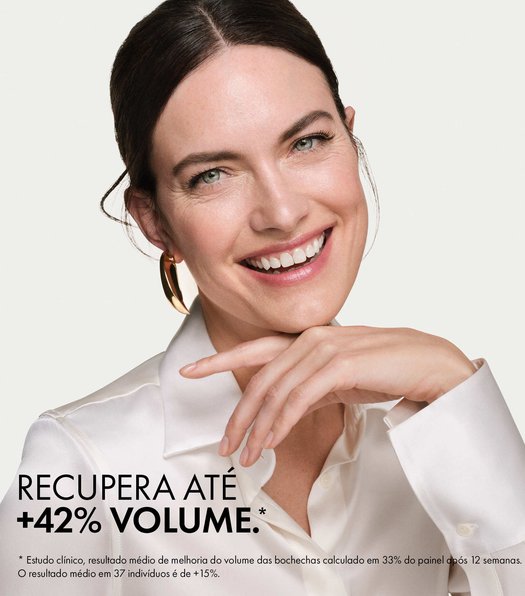 - 2 Estudo clínico, resultado médio de melhoria do volume das maçãs do rosto calculado em 33% do painel após 3 meses. O resultado médio em 37 indivíduos é de +15%.