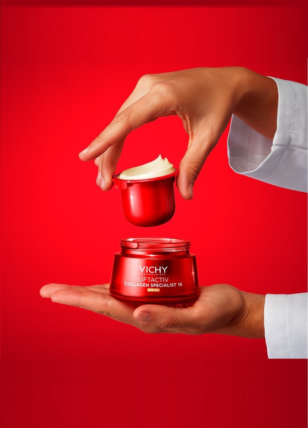 Vichy Liftactiv Collagen Specialist 16 Creme FPS 50, com a nova tecnologia exclusiva Co-Bonding Tecnologia Co-Bonding [Ramnose+Péptidos+Maitake], para potenciar e unir todas as famílias de colagénios*. Agora com FPS 50 para uma proteção contra a exposição solar diária. Esta fórmula corrige 16 sinais de envelhecimento**, para uma pele visívelmente mais jovem: rugas, linhas finas, firmeza, volume, flacidez, suavidade, textura cutânea, tonicidade, força da pele, renovação da superfície celular da pele, luminosidade, pele macia, elasticidade, hidratação, vitalidade e homogeneidade.