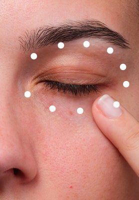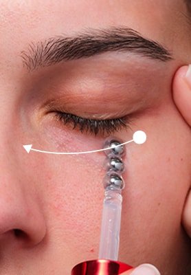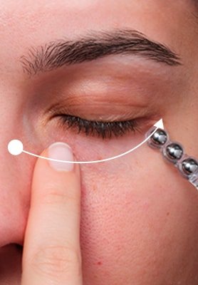 Use o aplicador para: (1) Realizar movimentos circulares. (2) Alisar a pele com movimentos na direção oposta. (3) Pressionar em 10 pontos-chave ao redor dos olhos.