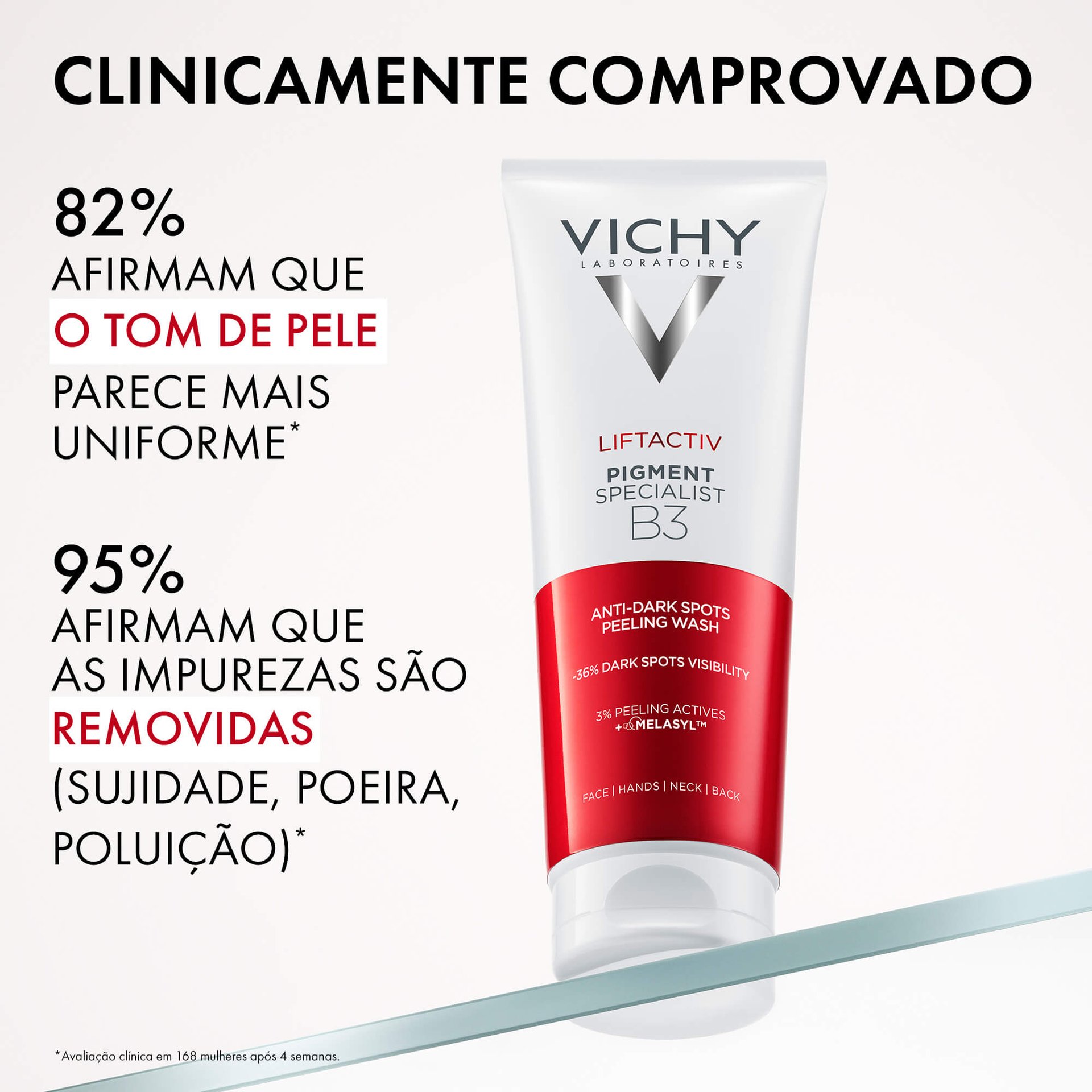 * Avaliação clínica, 49 mulheres, 8 semanas. Visibilidade das manchas.